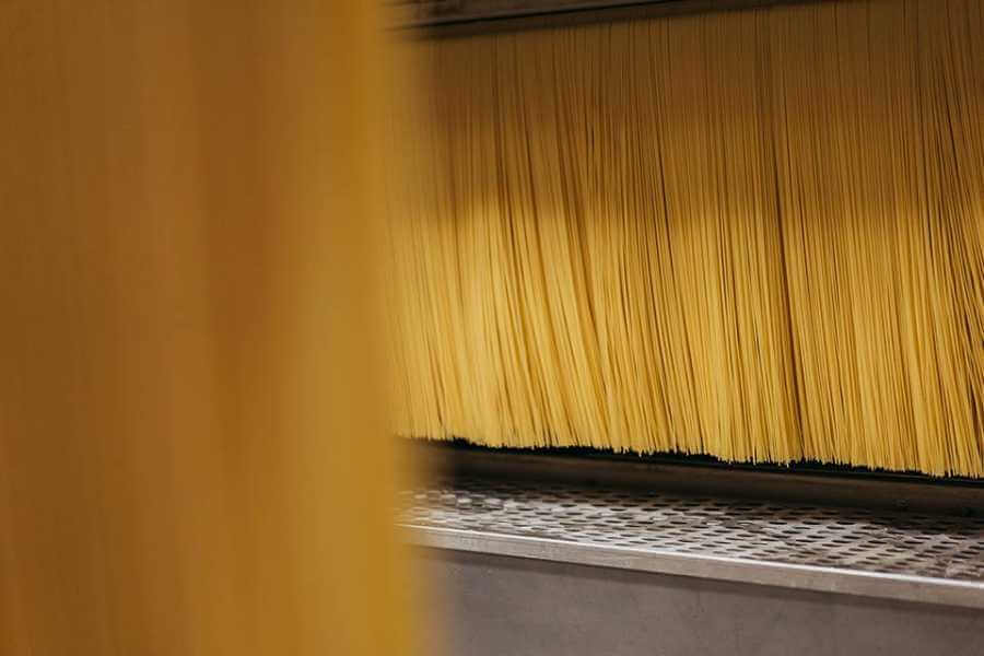 La pasta lunga che esce dalla trafila viene appesa a un asse per raggiungere il processo di essiccazione, a ricordare quelli messi al sole come da tradizione italiana.