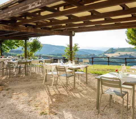 Qui trovano posto 60 coperti nella sala interna e altrettanti nel pergolato esterno. Da quest’area è possibile godere di una splendida vista e ammirare tramonti mozzafiato. Ti invitiamo a perderti con lo sguardo fino a scorgere il monte “Titano” di San Marino e il mare di Cattolica nelle giornate più terse.